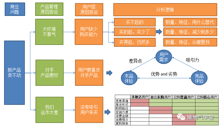 用户画像分析,本质上是从用户的角度思考问题。举个简单的例子,比如新上市产品销售未达预期,我们既可以从产品管理的角度来思考问题,也能从用户角度来思考问题。同样一个问题,会有两种思考方式(如下图所示):