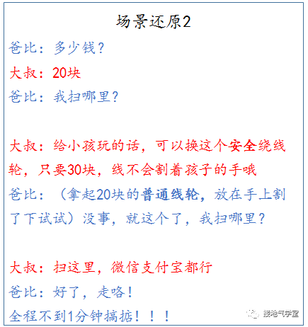 但是先确认家长愿意买,再推荐一个“不伤手”卖点的贵绕线轮,成功率就大大提升。因为已经确认了:这个家长肯迁就孩子,那肯迁就孩子的家长,肯定大概率会买个贵的。实际上,不完全统计,现场有一半都是“不伤手”的绕线轮,嘿嘿,其中滋味,你品,你细品。