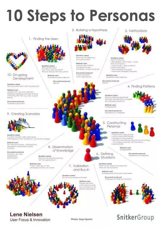 这 10 个步骤是理想的过程,但是有时候并不包括所有步骤。在这里我们概述 Lene Nielsen 在她的文章-交互设计百科全书「用户画像」中讲述的十步法。