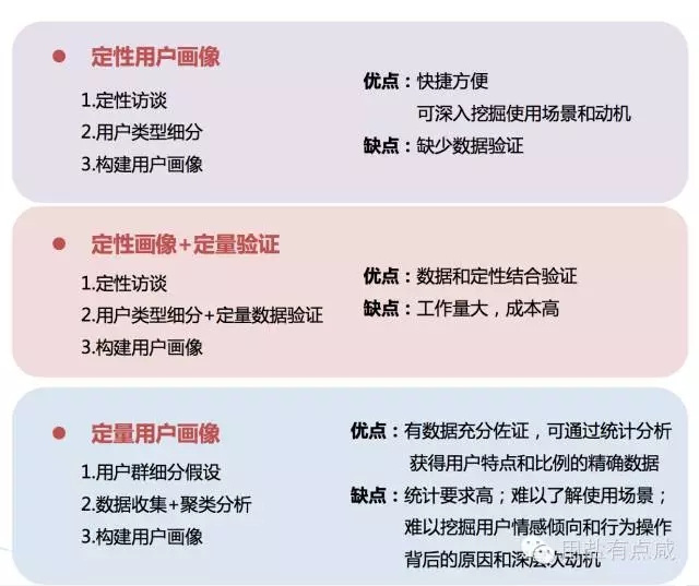 采用定性的方法(如,深度访谈、焦点小组)或定量的方法(如,定量问卷、行为日志数据)都能够完成用户画像的构建,不同的方法各有优缺点:
