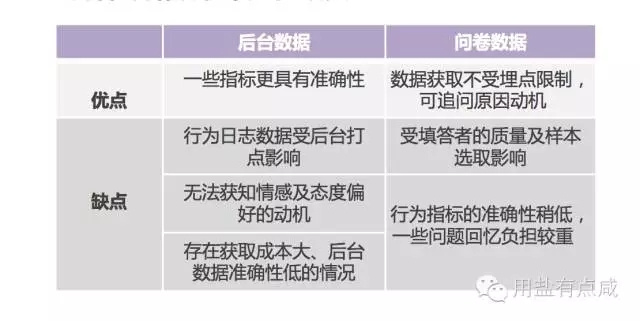 在确定指标后,我们需要确定指标的来源。有些数据是后台行为日志可以记录到的,有些是需要用问卷调查的。一般而言,行为层面的指标可以用后台日志,更加准确。而态度层面的则要用问卷来获取。两种数据渠道各有优缺点: