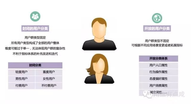 用户指标的选择,可以是封闭性的,也可以是开放性的。在封闭的指标中,用户群的类型是固定的,所有用户类型构成了全部的用户整体,比如轻度用户、重度用户;男性用户,女性用户。但是这种划分方式维度可能过于单一,无法体现用户群的复杂性,并且不利于指标体系的补充改进和迭代,因此在研究中我们更倾向于采用开放性的分类方式,可以根据不同应用场景变更或者拓展指标。