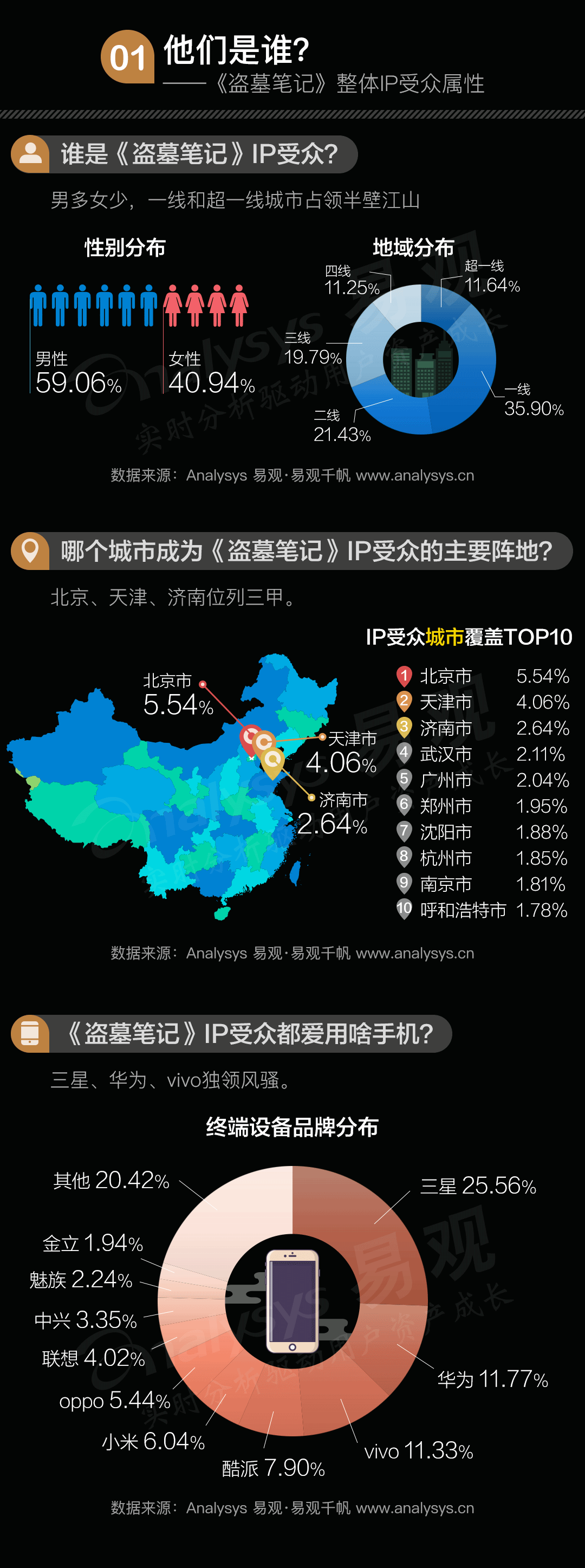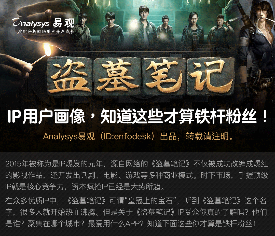 在众多优质IP中,《盗墓笔记》可谓“皇冠上的宝石”,听到《盗墓笔记》这个名字,很多人就开始热血沸腾。但是关于《盗墓笔记》IP受众你真的了解吗?他们是谁?聚集在哪个城市?最爱用什么APP?知道下面这些你才算是铁杆粉丝!