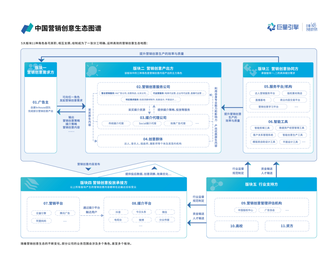 今天,除了广告公司在提供创意服务之外,自媒体、KOL、网红、主播、MCN以及大众用户,实际上都在投入到创意的生产过程中。最近巨量引擎官方智库“动见”与《财经杂志》出品的《创意进化论》特刊中梳理了一张营销创意生态图谱值得大家参考: